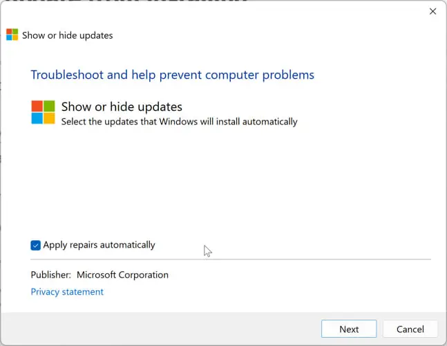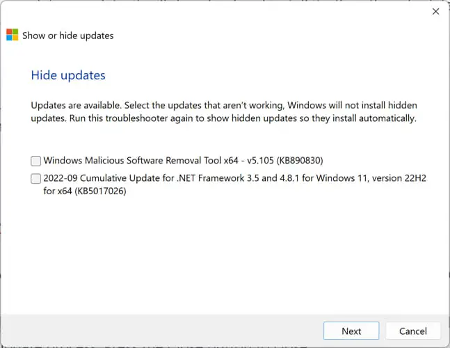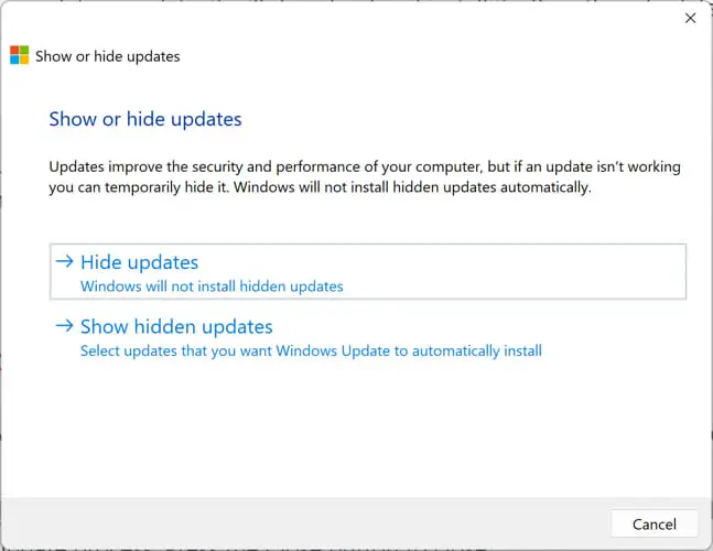 下载“显示或隐藏更新”工具从微软。