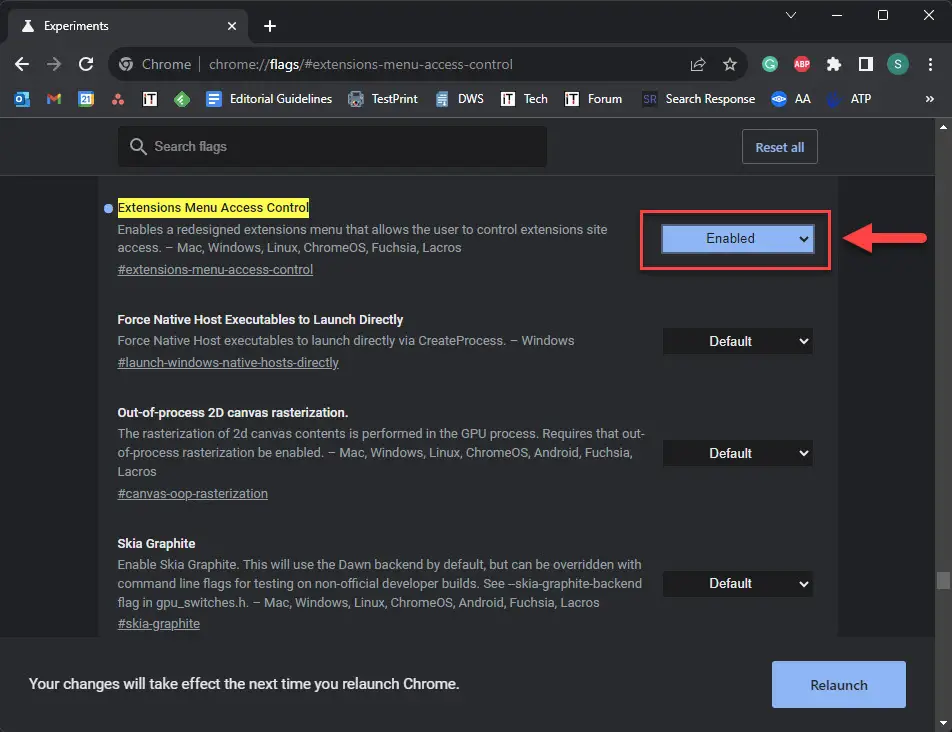 打开浏览器标志的设置 这将打开铬标记页面的“扩展菜单访问控制”标记高亮显示。